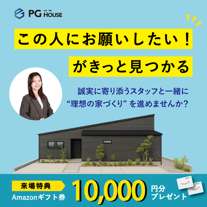 足を運んでいただくことに感謝を込めて。あなたの家づくりの一歩を応援します!PG HOUSE のモデルハウス見学にWEBから初めてご予約いただいた方には、来場特典としてAmazon ギフト券10,000円分プレゼント!