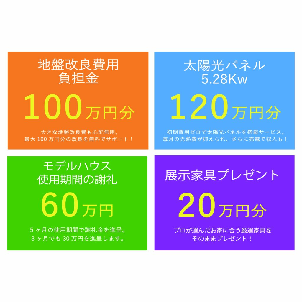 ZEH補助金や太陽光発電の設置、モデルハウスとしての賃借料、さらに展示家具のプレゼントも含まれた、見逃せない特典内容です。